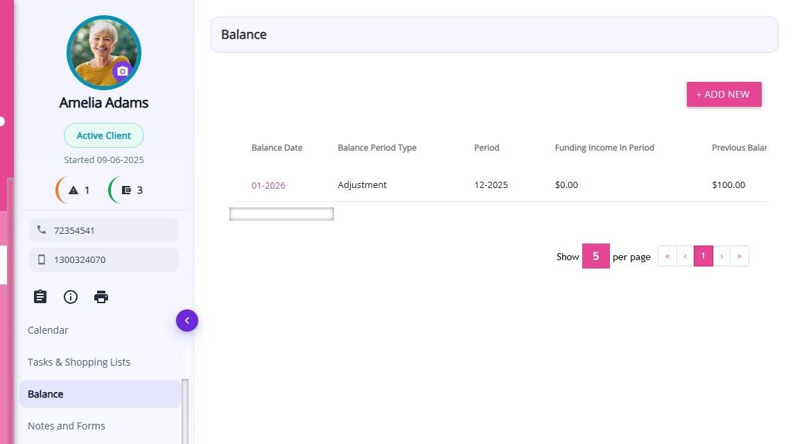 The Balance section allows organisations to track and manage a client’s account balances across different funding sources and time periods. It provides visibility into available funding, previous balances, and income received during a specific period.