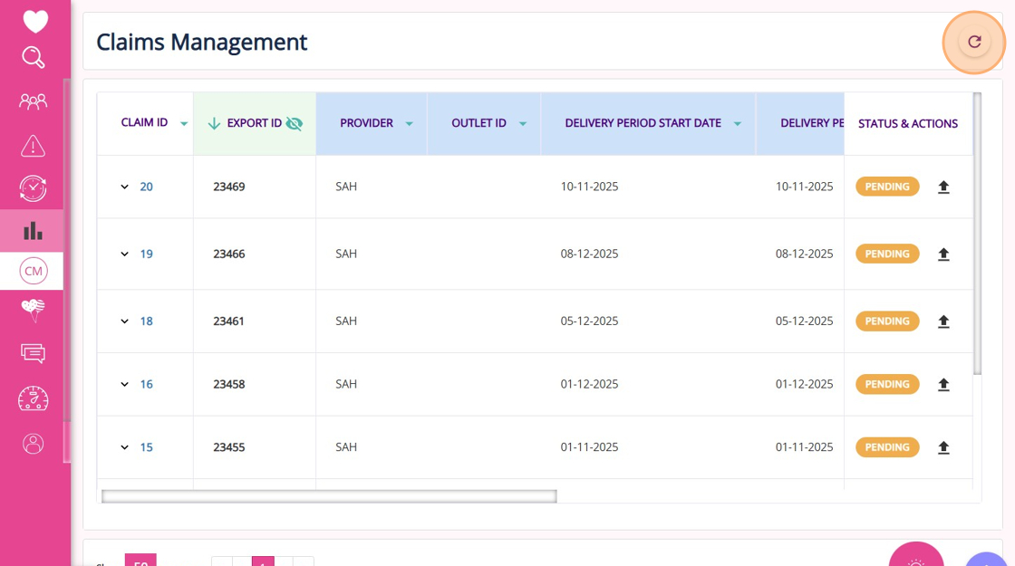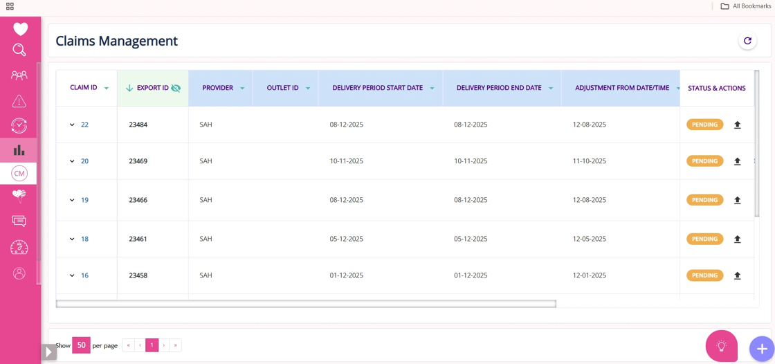 Export ID | Identifier for the export batch or file associated with the claim. You can expand or collapse the Export ID column by clicking the “eye” icon (which may be updated to an arrow in the future). This displays or hides additional columns for each claim. This feature is useful for organizations with many outlets, as it helps manage screen space and focus on relevant data. |