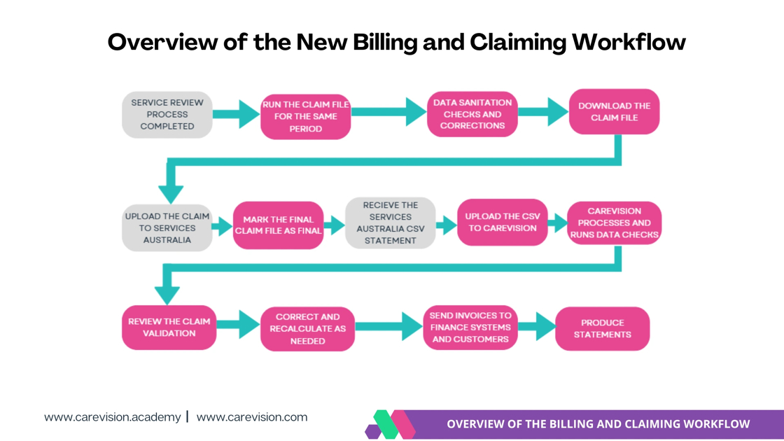 The Claims Management dashboard is a key feature introduced as part of the new billing and claiming process under the Support at Home program. The dashboard will be useful during the upload of claim files to CareVision, providing users with tools to review validations, address discrepancies, and monitor the status of each claim before finalizing invoices and statements.