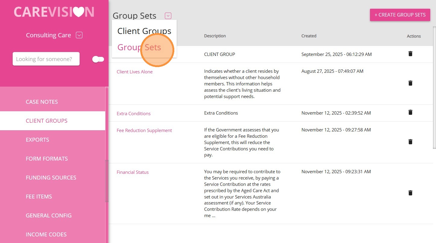 - Group Sets can be configured by navigating to Settings > Client Groups > Group Sets in the left navigation pane.