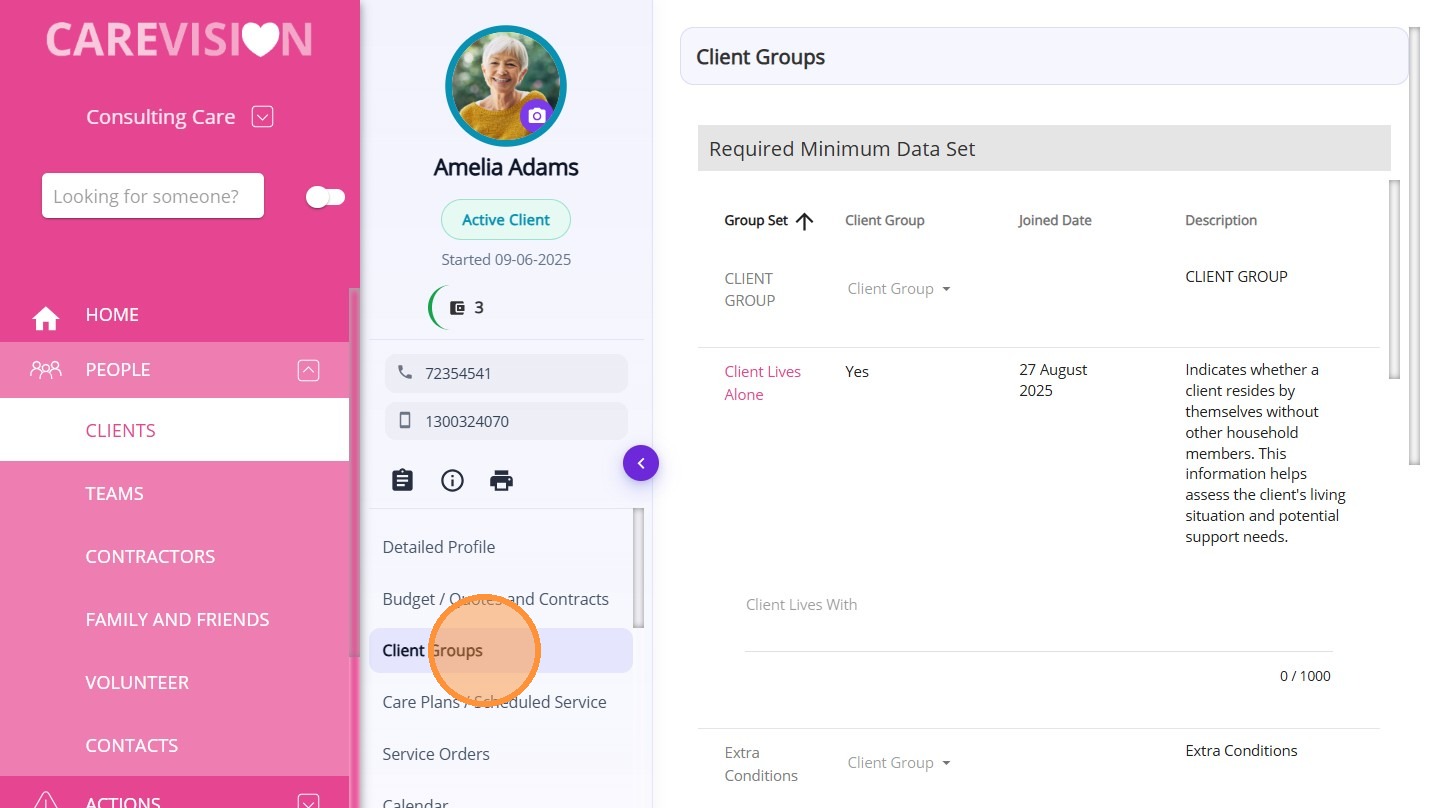 The Client Groups section in the Client Profile is used to classify and manage important information about a client based on categories defined by your organisation. These classifications help organise clients based on their care needs, medical requirements, funding rules, status, or other operational specifications.