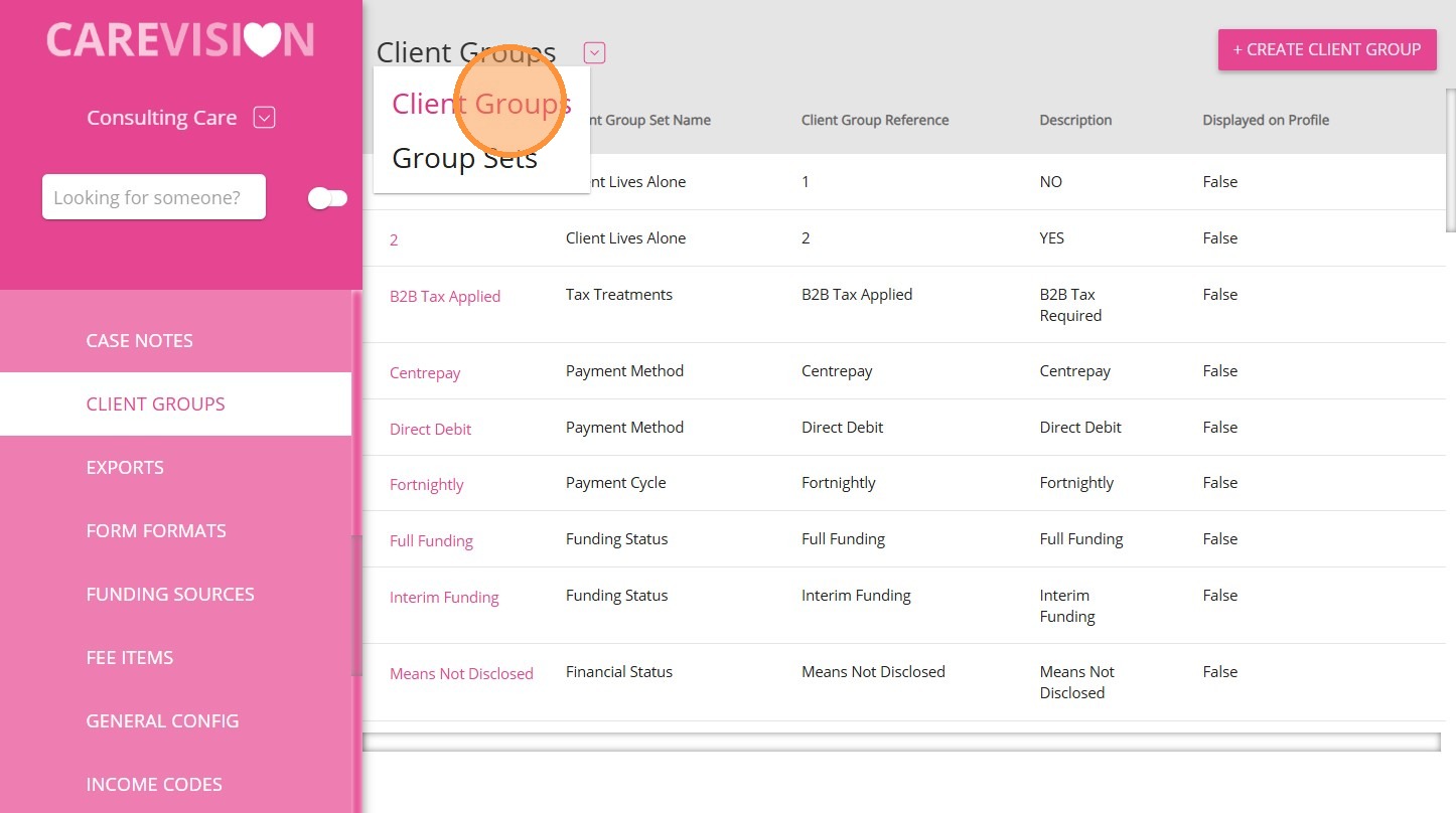 | Client Groups | Client Groups are individual classification options within a Group Set that are used to categorize clients based on specific attributes. If multiple options apply for a Group Set, each option must be created as a separate Client Group.