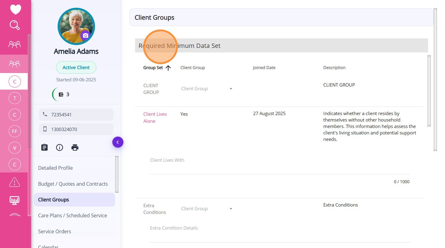 Note: If a client’s situation changes, the existing Client Group must first be ended by adding an End Date, and then the client should be added to the new Client Group with the same date as the previous End Date.The Required Minimum Data Set section displays essential client information needed for compliance, reporting, and operations. In this section, you can assign the client to a group set, add a join date, or remove them as needed.