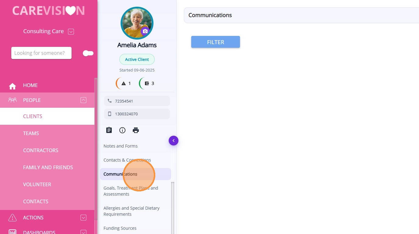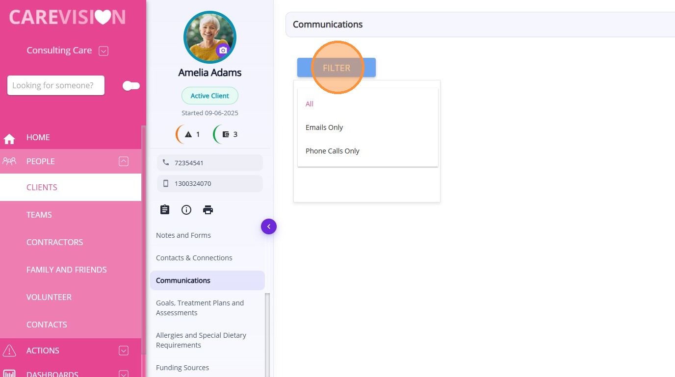 The Communications section allows organisations to track and review all inbound and outbound communications between staff and clients. It provides a central place to monitor email correspondence and phone call records related to the client.