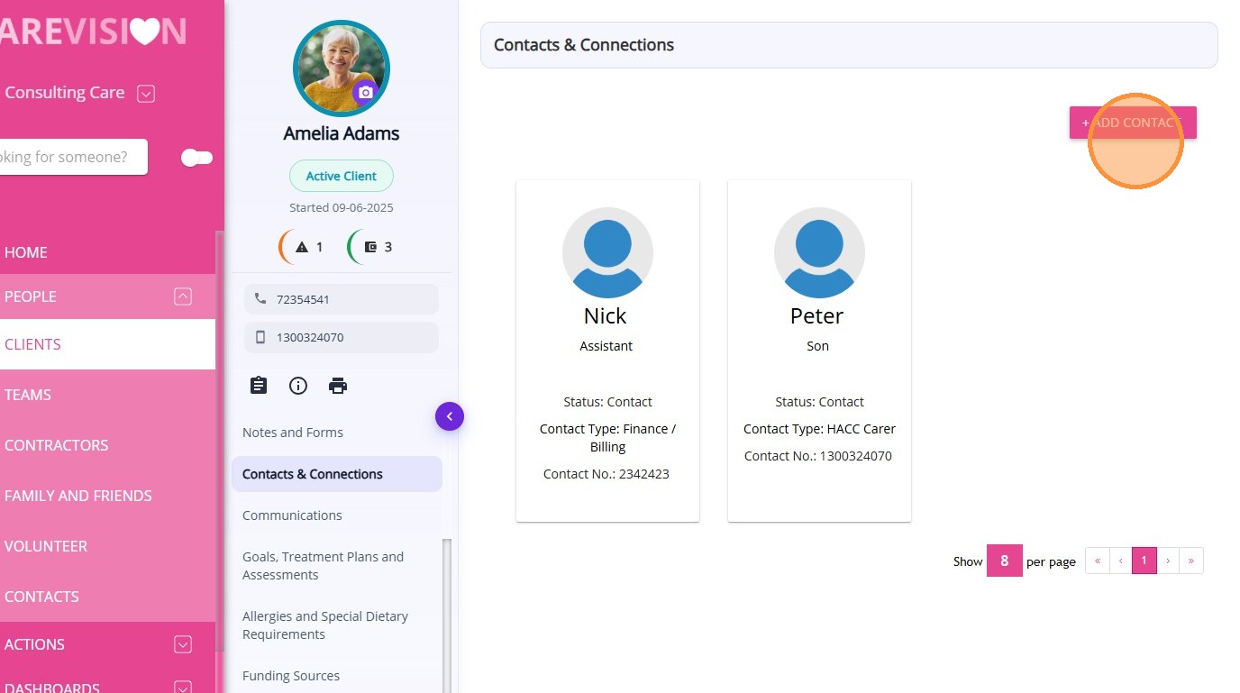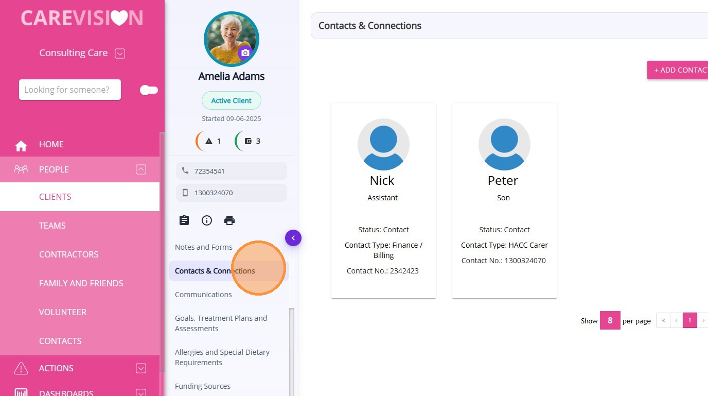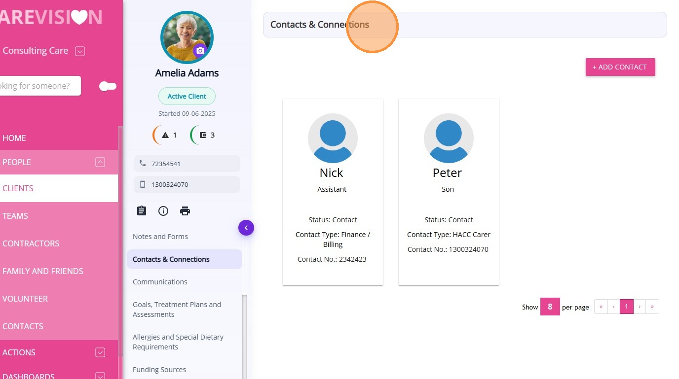 The Contacts & Connections section allows organisations to record and manage important people connected to the client. This allows staff to quickly access contact details for individuals involved in the client’s care, support, administration, or decision‑making.