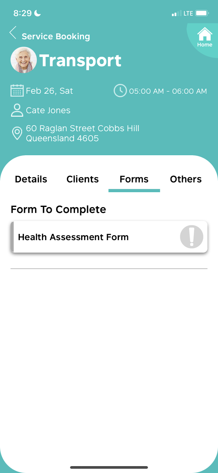 Lightly tap on the booking on your mobile phone to be able to see the full details. You can see the sections for Details, Clients, Forms and Others.