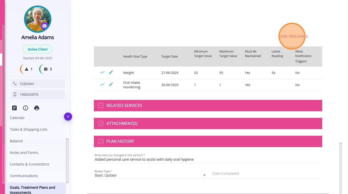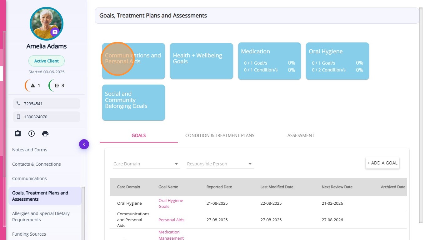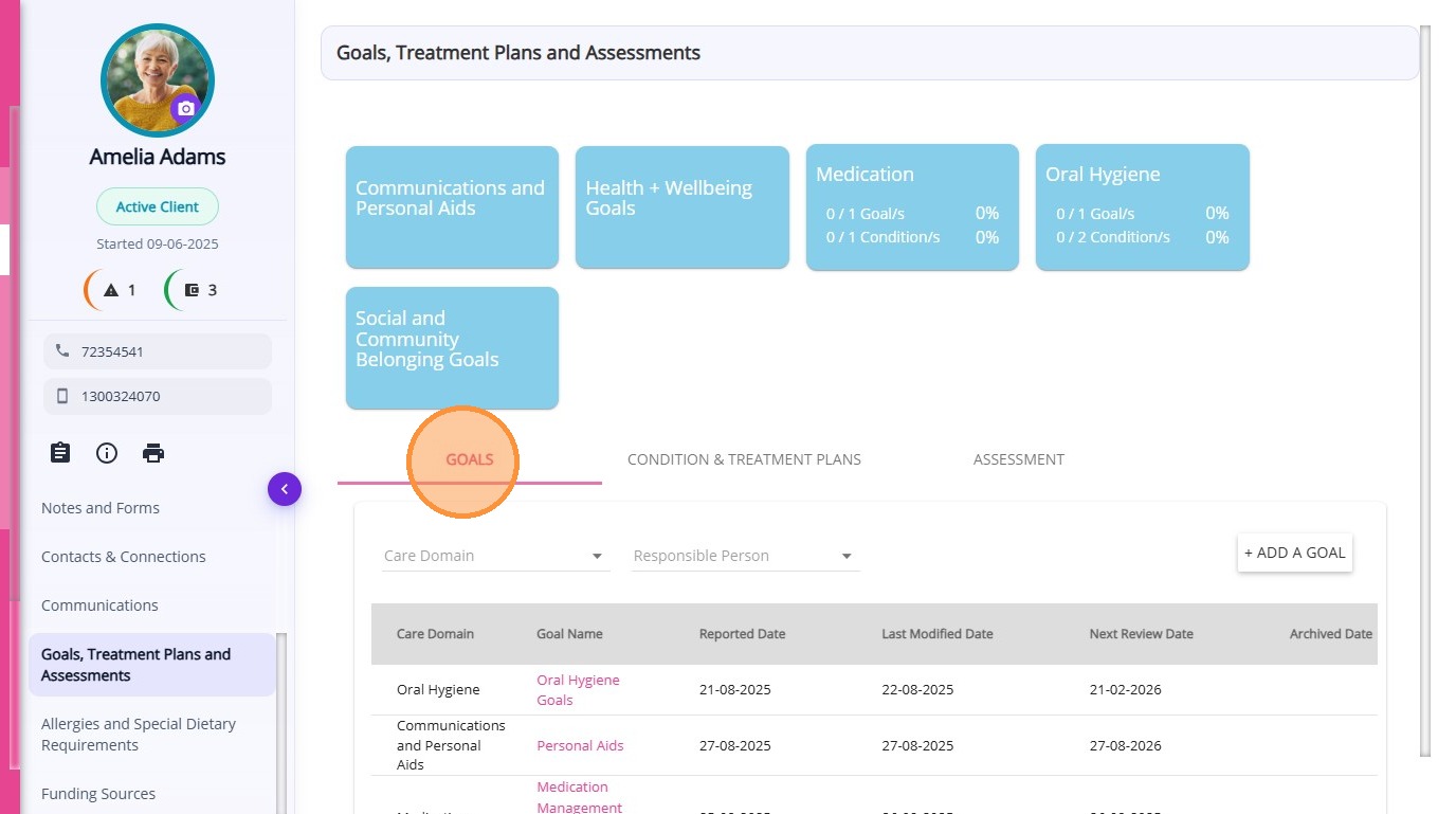 The Goals, Treatment Plans and Assessments section helps care teams document client objectives, monitor health conditions, and evaluate care outcomes. By linking goals, treatment plans, and assessments to care plan services, organisations can ensure services align with the client’s needs and progress can be monitored over time.