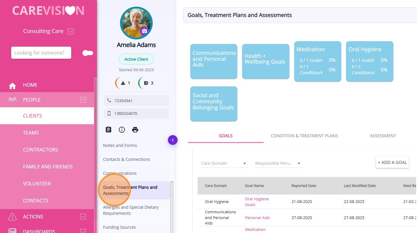 Keywords: client goals management, treatment plans carevision, client assessments tracking, health goal tracking, care plan service alignment, aged care documentation, disability support planning, client care planning system, clinical assessment records, client outcome tracking