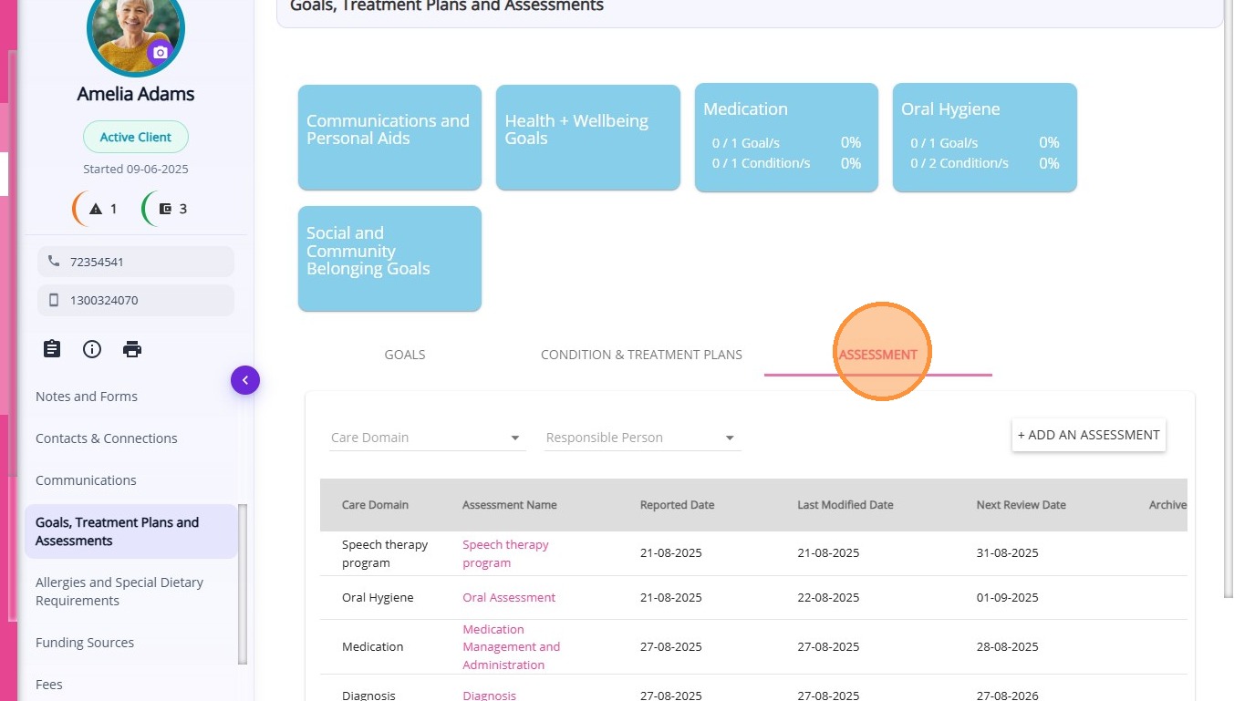 The Goals, Treatment Plans and Assessments section in the Client Profile displays all care goals, treatment plans, and assessment records associated with the client.