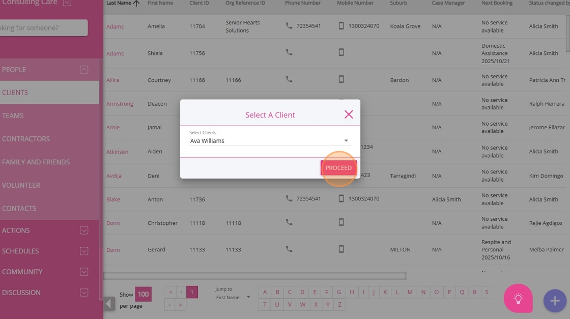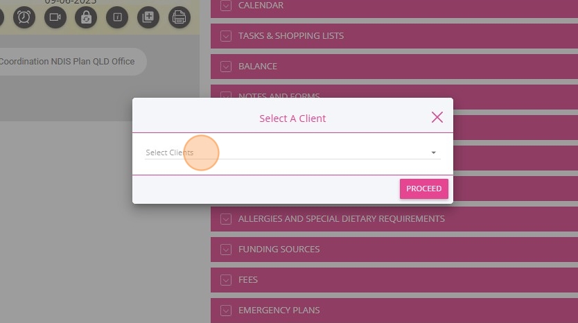 4. In the Select Clients field, either scroll to find the client or type the client’s name in the search bar.