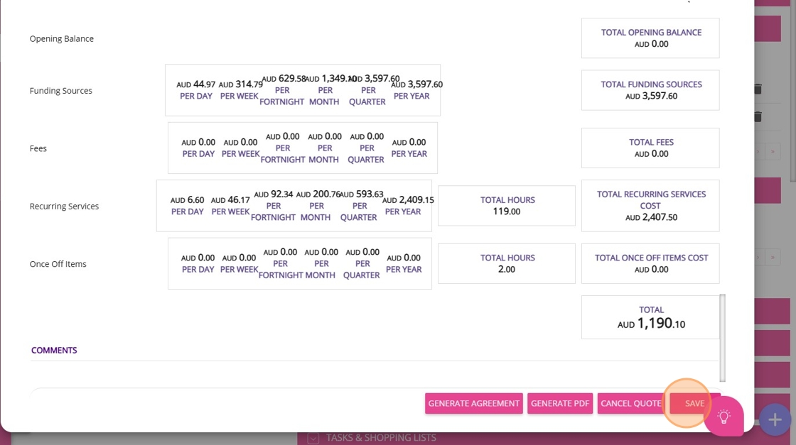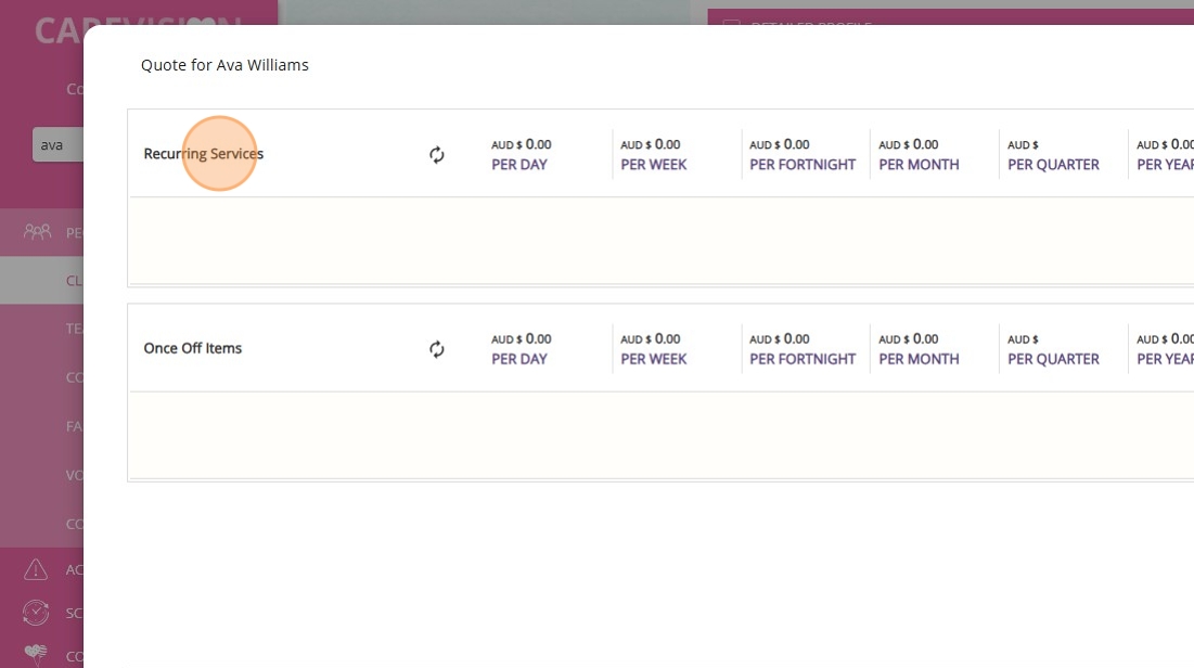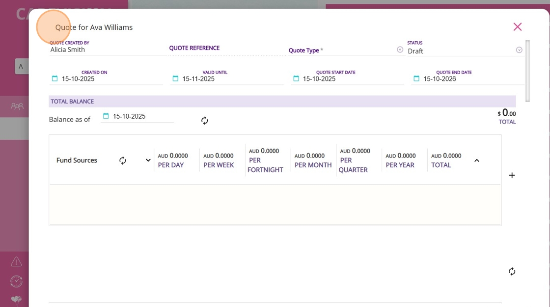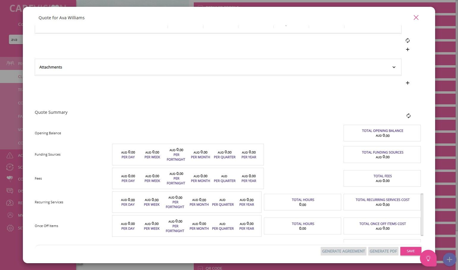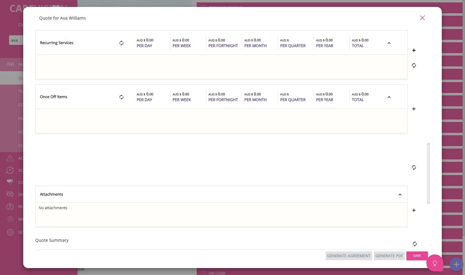 The Quotes & Contracts Window brings together all the tools needed to create a client quote, including options for managing income streams, fees, recurring charges, and one-off service charges.