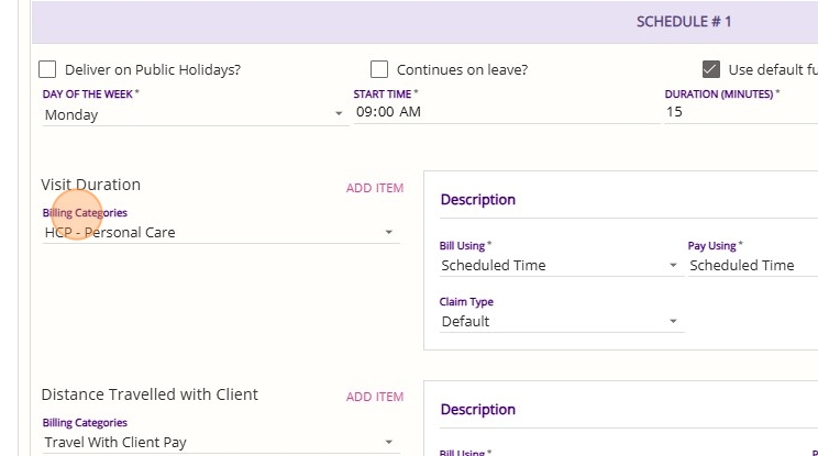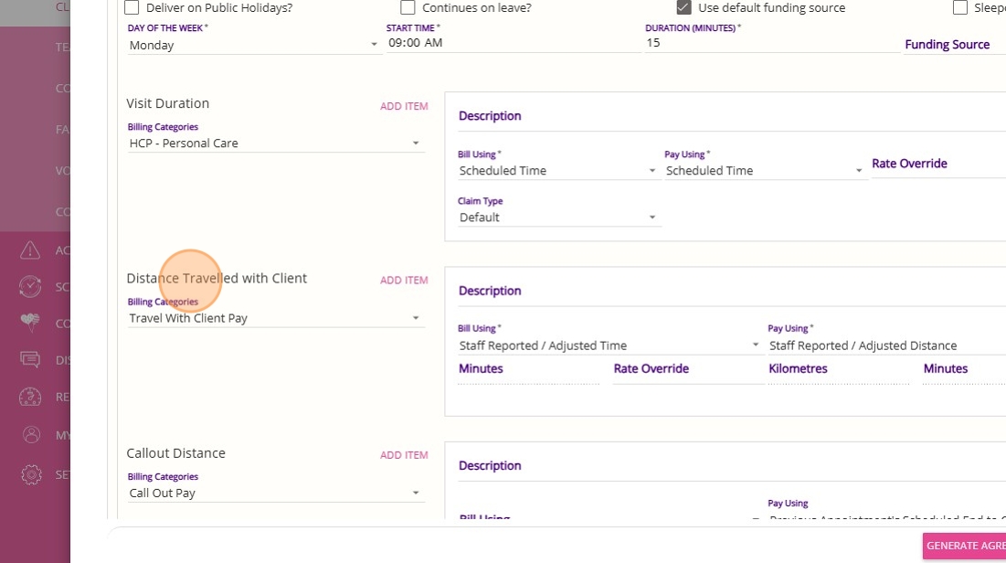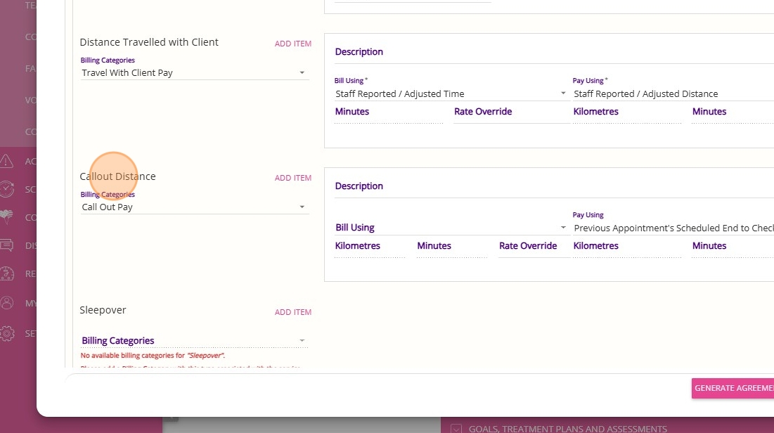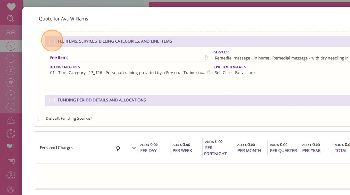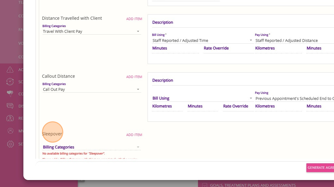 1. Go to the Fee Items, Services, Billing Categories, and Line Items section. The settings in this section come from your templates, so you usually don’t need to change them. They show the rates for support at home and help prevent selecting old home care rates by mistake.