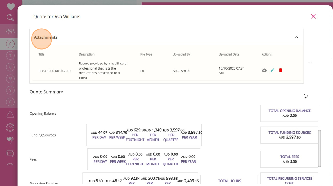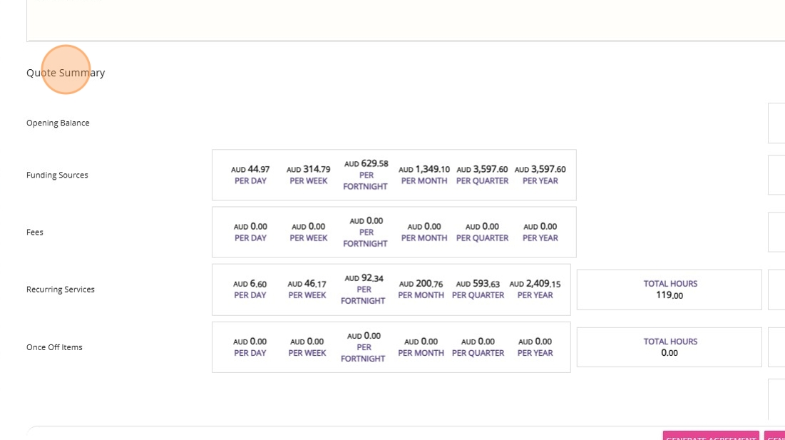 You can view the quote summary, which includes the opening balance, funding sources, fees, recurring services, and once-off items. Adjust funding amounts or service details as needed.