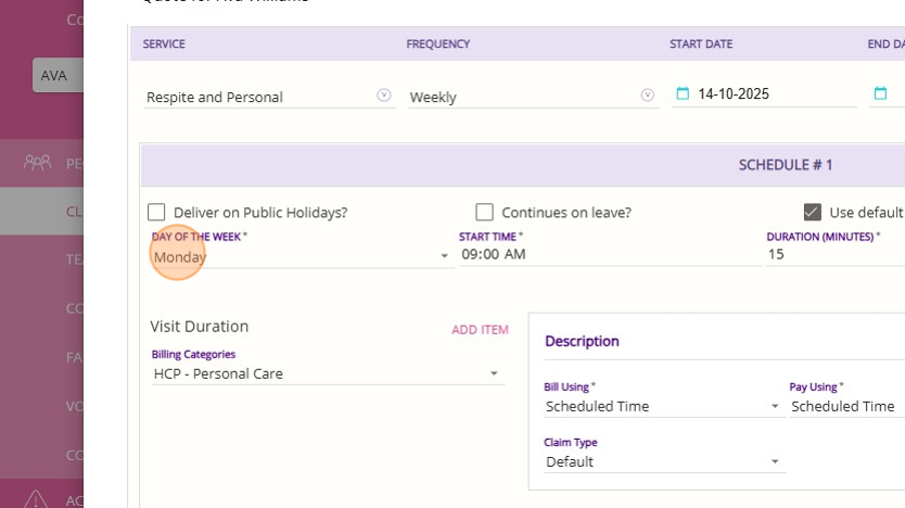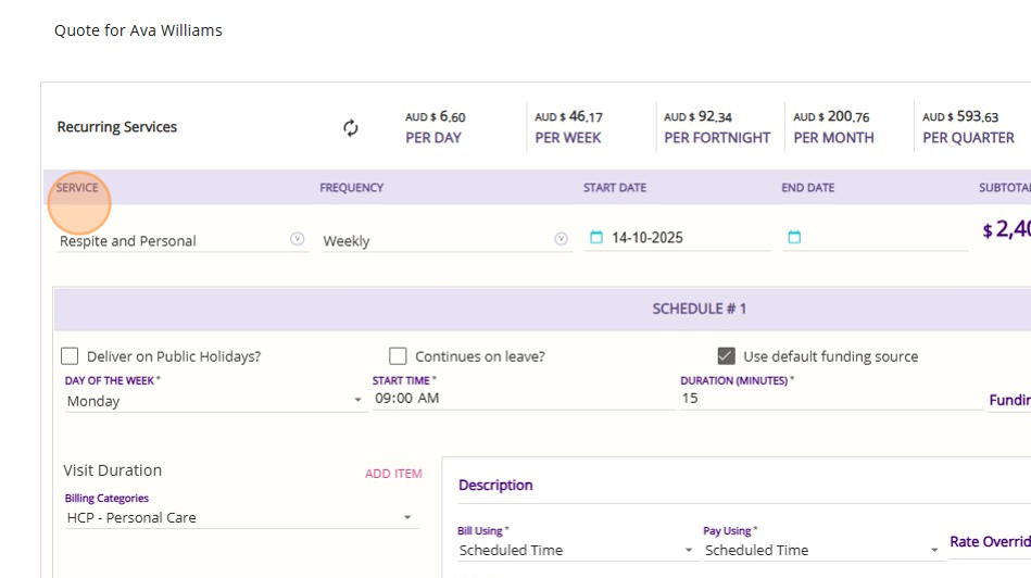 To copy the recurring service schedule, click Copy Schedule. This will duplicate the recurring service details and billing categories, making it easy to set up daily services without manual data entry.