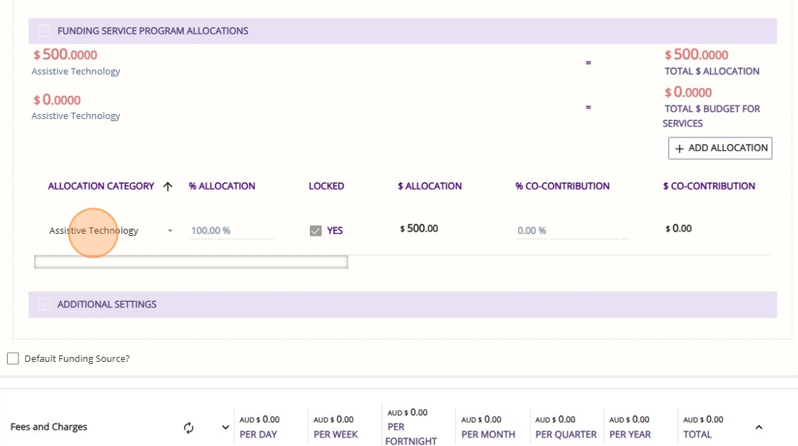 Note: Leave the box Use default funding source unticked. Assistive Technology and Home Modifications each have their own budget and balance, so services must be manually linked to the appropriate funding source when added.