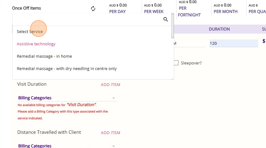 - Select a service. For accurate reporting and tracking, make sure you select the relevant service for Assistive Technology funding. If you are using the Home Modifications funding, select the corresponding home modification service from the list.