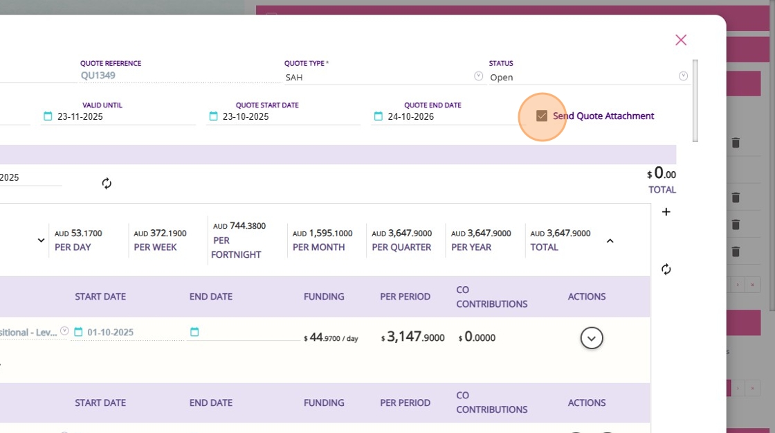 - When you set the quote status to Open, a checkbox labeled Send Quote Attachment appears. If you check this box before saving, a PDF copy of the quote will be automatically emailed to the client when you Save the quote.