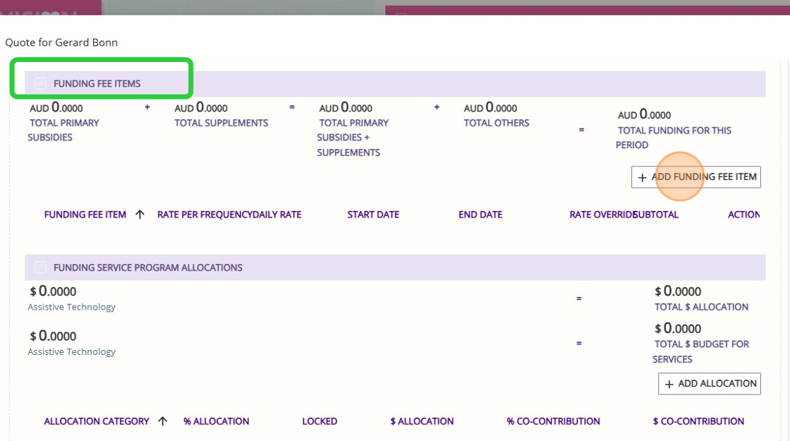 - Under the Funding Fee Items section, click Add Funding Fee Item to include the Assistive Technology or Home Modifications funding fee item.