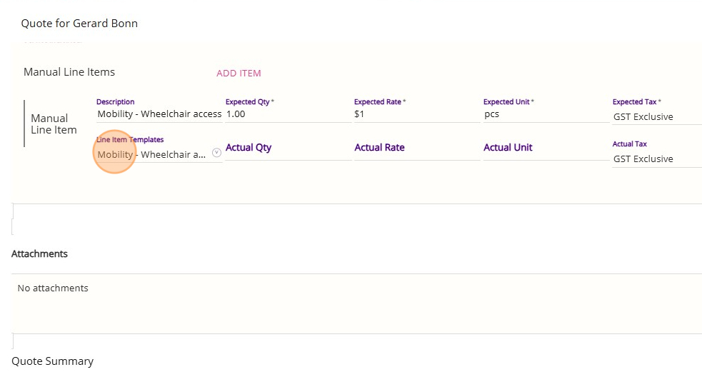 As a prerequisite, you must set up Manual Line Item Templates before creating quotes. The templates provided in the Config Workbook are designed to match the exact requirements for claiming. By selecting one of these manual line item templates, you can set your own dollar amounts and quantities, and you can also enter your own description.