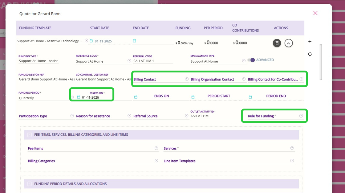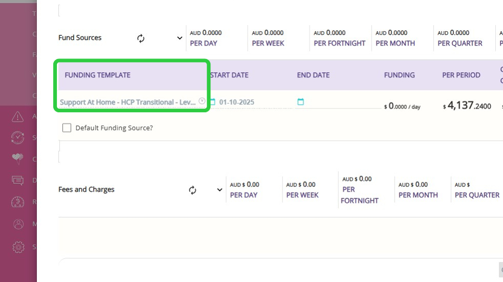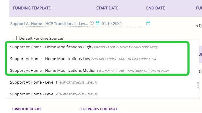 - In this example, the client has an existing Support at Home funding template. Since Assistive Technology and Home Modifications are managed as separate funding in CareVision, you need to add a separate template for each.