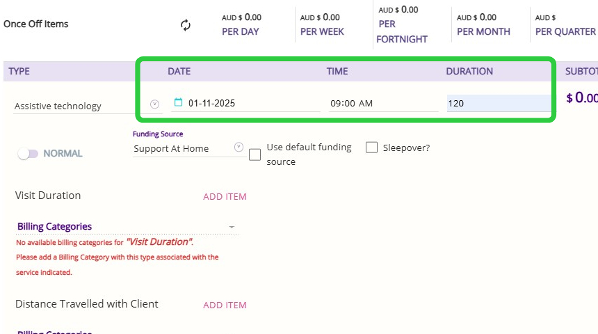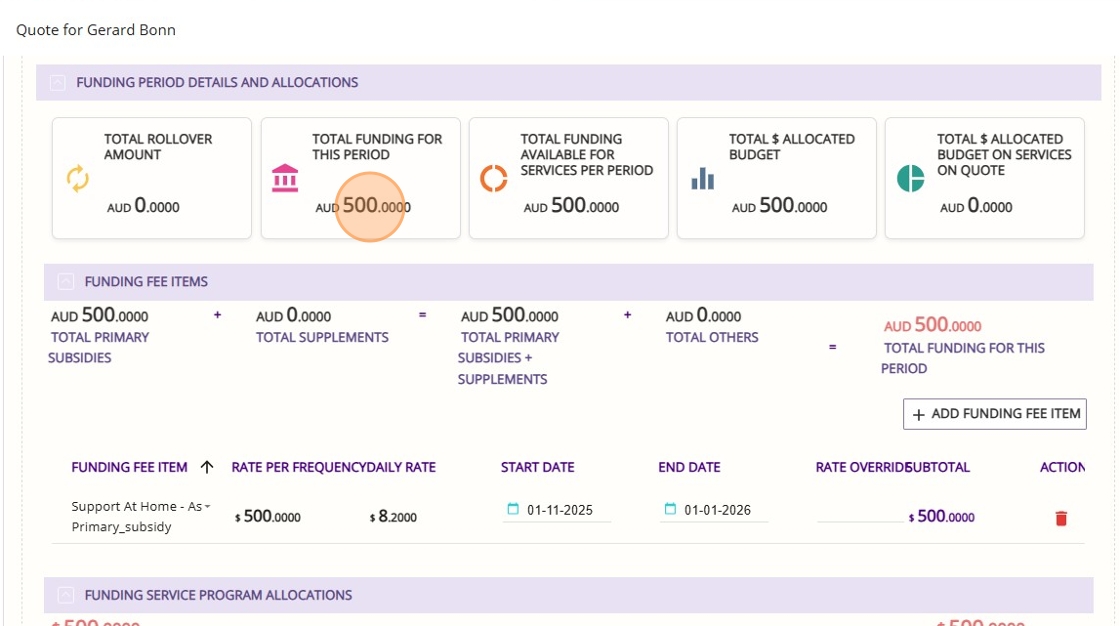- Once you select the relevant funding fee item, its corresponding dollar amount will be displayed. In this example, Support at Home Assistive Technology Low shows an amount of $500. When you add this funding to the client, the item will be listed as a one-off payment. If you print out the quote, it will also show a one-off amount of $500.