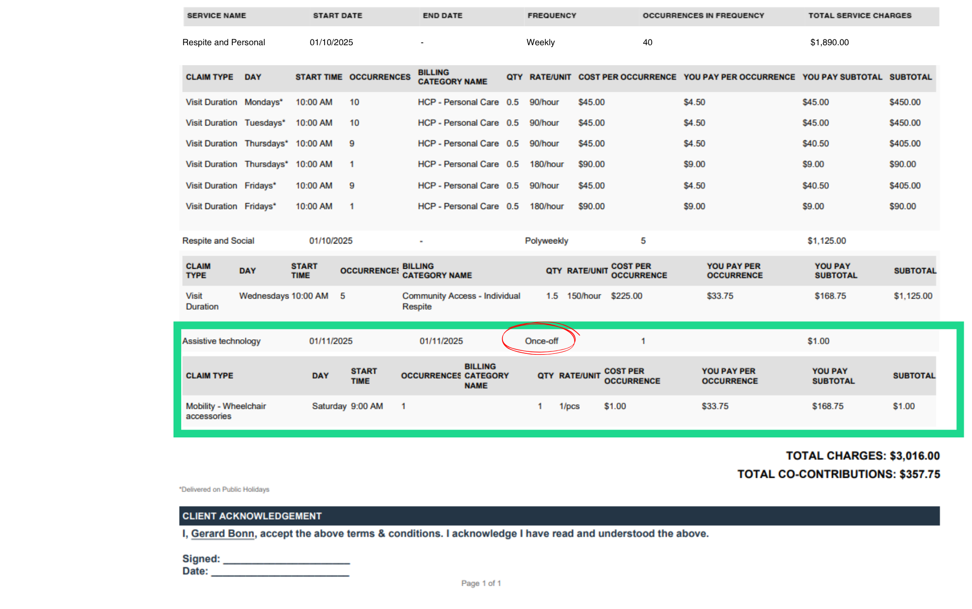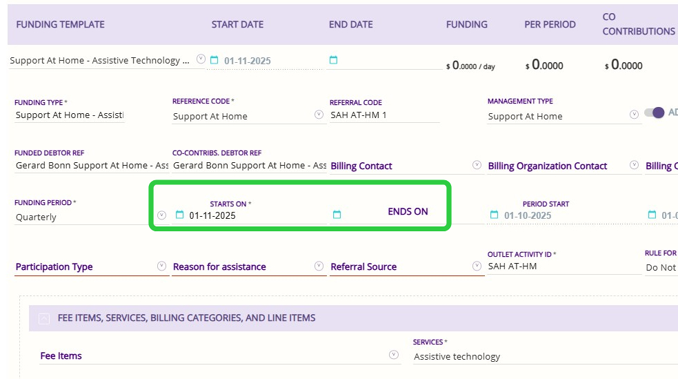 - The duration between the Start Date and End Date fields is typically 12 months, as this is the standard period allowed to use the Assistive Technology and Home Modifications funding.