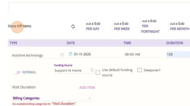- Scroll to the Once Off Items section.
