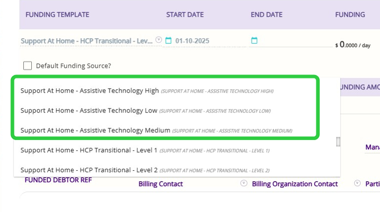- In this example, Support at Home Assistive Technology Low is selected because it aligns with the previously selected funding source. If you are working with Home Modifications, that option will appear instead.