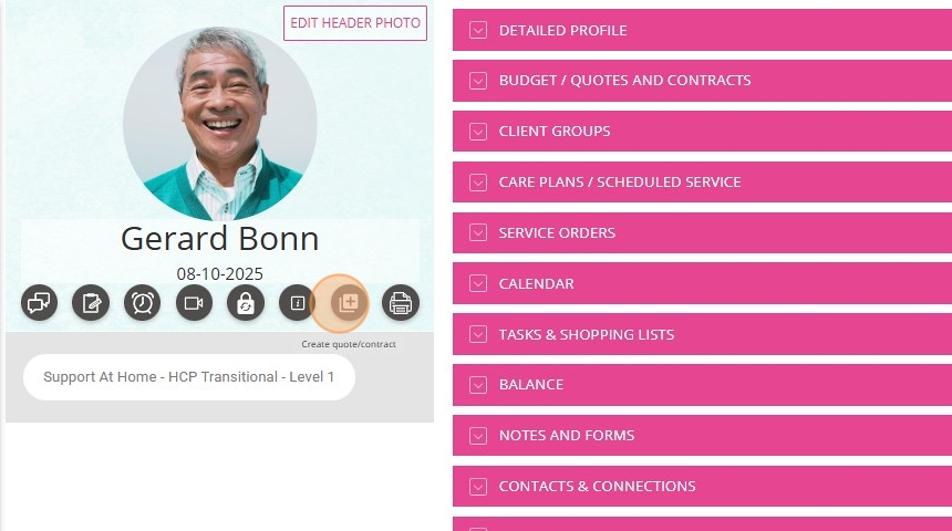 - Go to the client profile for which you want to create a quote. Below the client’s profile, click the plus icon labeled Create Quote/Contract.