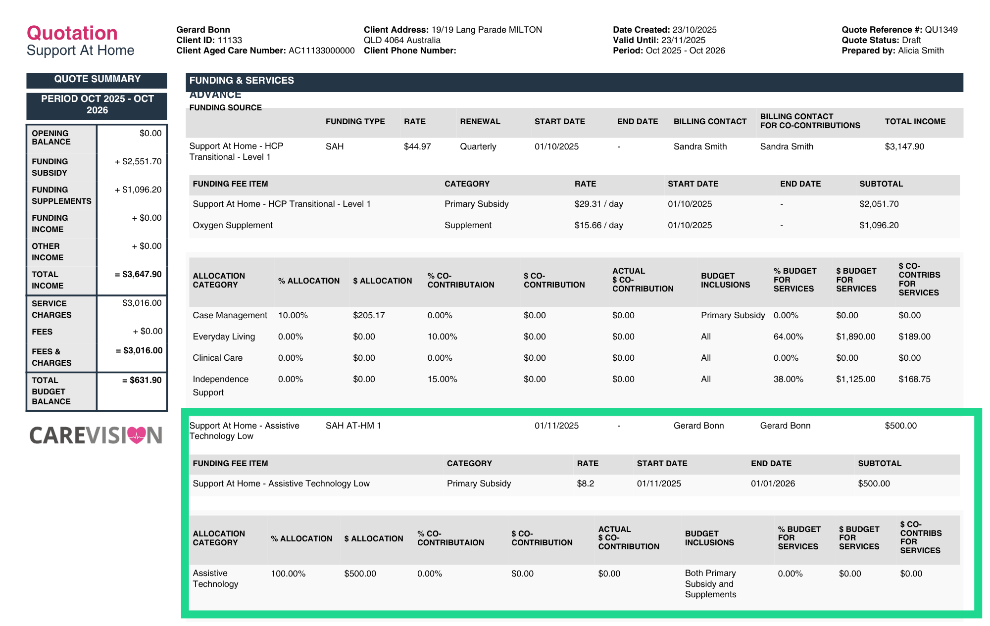 In CareVision, Assistive Technology and Home Modifications are managed as separate funding sources. These are distinct from the participant’s quarterly Support at Home budget and are tracked independently within the system.