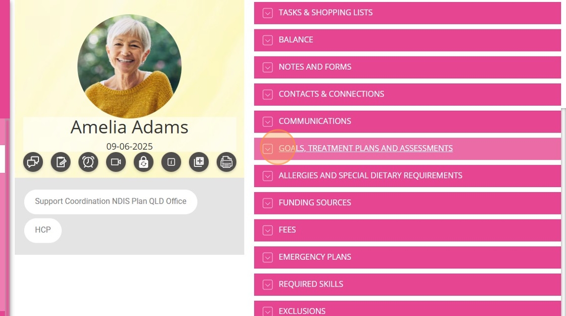 2. In the client’s profile, find the Goals, Treatment Plans, and Assessments section.