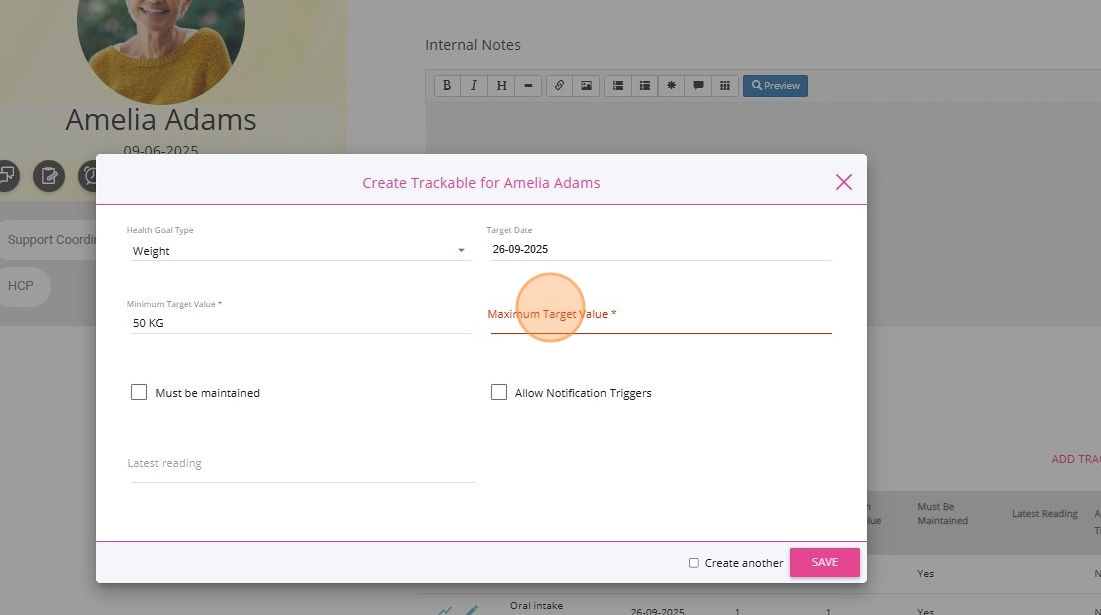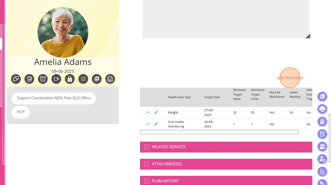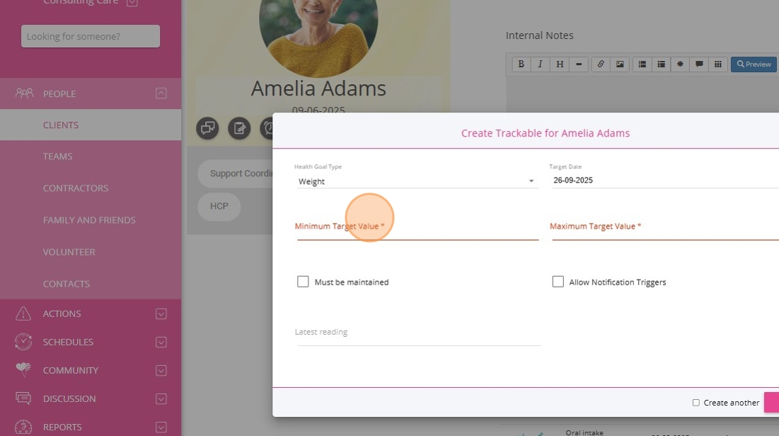 Add Trackable | Option to add a trackable metric for the goal. This field allows you add a specific metric to track progress toward the goal. This allows carers to record and monitor the client’s status as they work toward achieving their health goals. For detailed instructions, see Adding Trackable. |