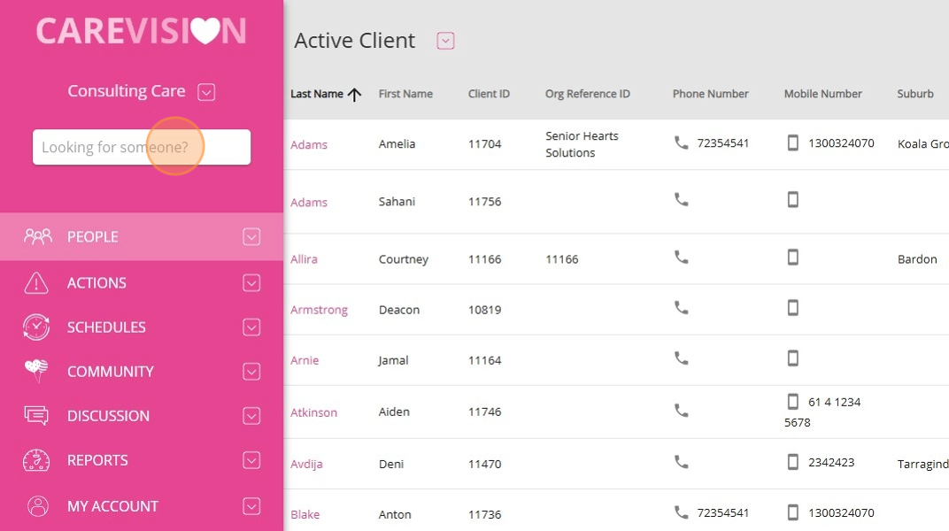 1. In the left navigation pane, search for the client’s name using the search bar.