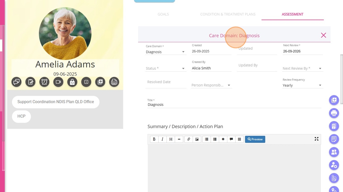 Care Domain | The specific area of care being assessed, such as mobility, nutrition, medication management, or other relevant aspects. Care domains may differ depending on the organisation’s focus (aged care, disability support, home care), ensuring assessments are relevant to each client’s needs. |