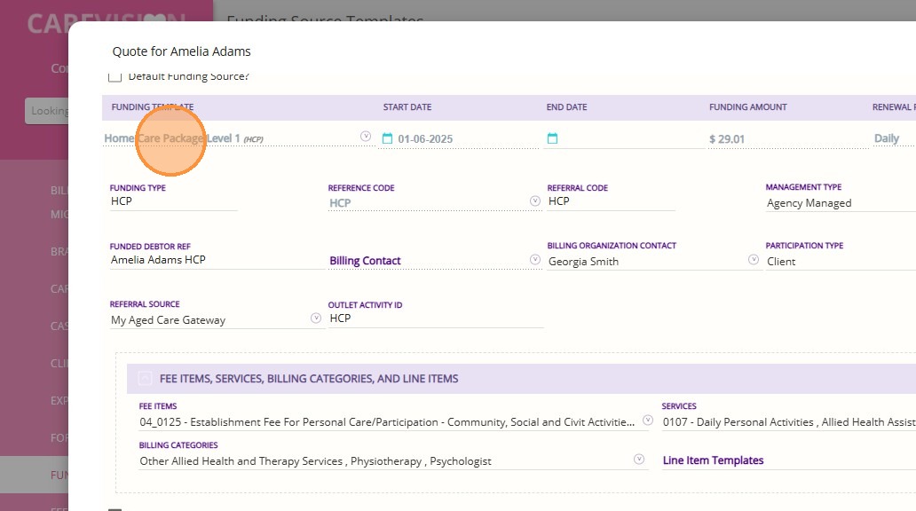 2. Expand the Funding Template section and navigate to the Fee Items, Services, Billing Categories, and Line Item Templates section.