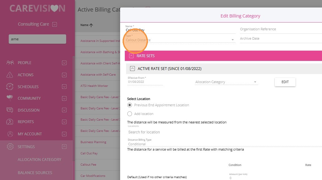 2. Make sure you have a billing category with the Type set to Callout Distance. In this example, the billing category named Callout Pay is used. If one does not exist, you can create a new billing category with this type and set the rates based on your business requirements.