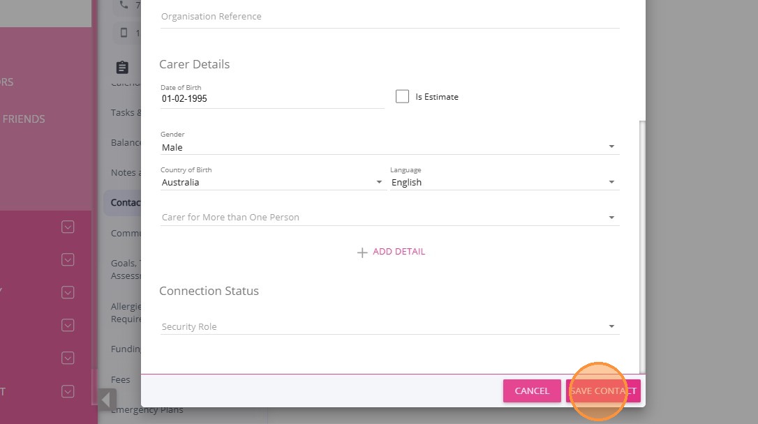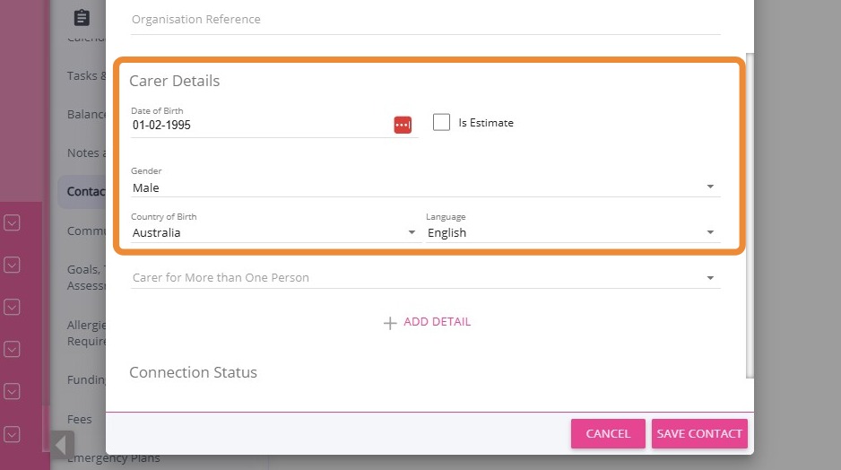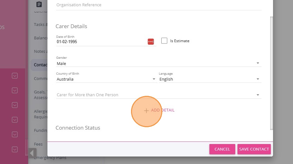 11. Click +Add Detail if the carer has additional information to record. In this section, you can specify if the carer is associated with a specific group set.