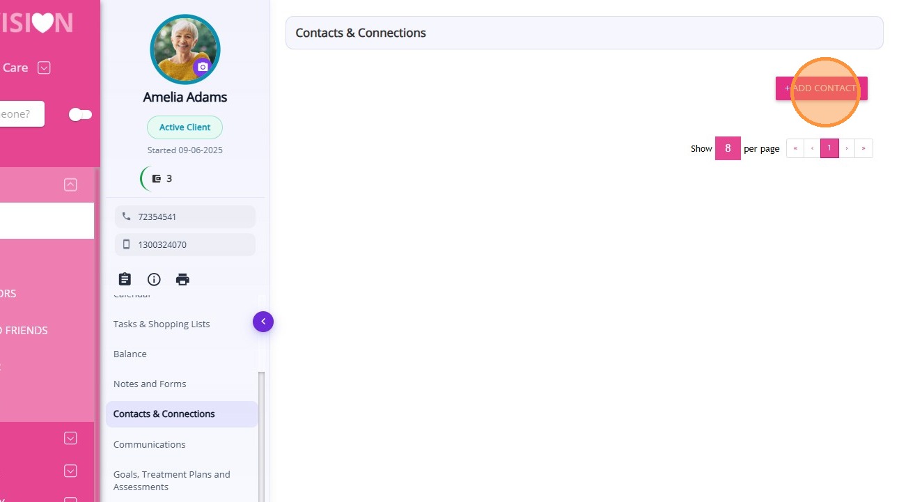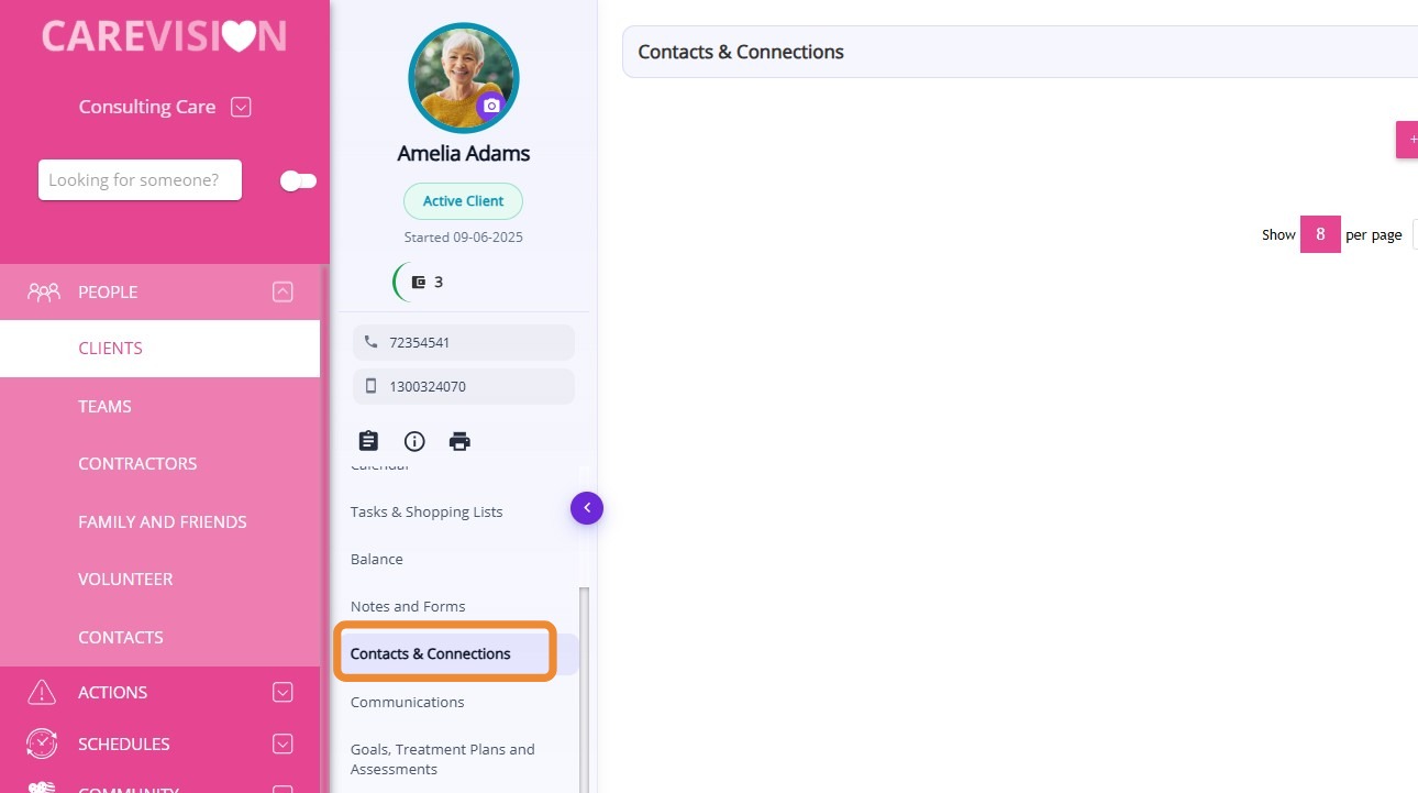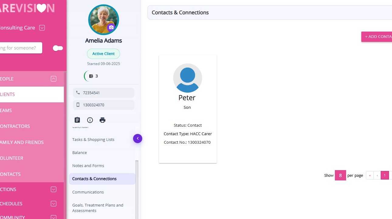 The newly created carer information is displayed in the Contacts & Connections module within the client’s profile.