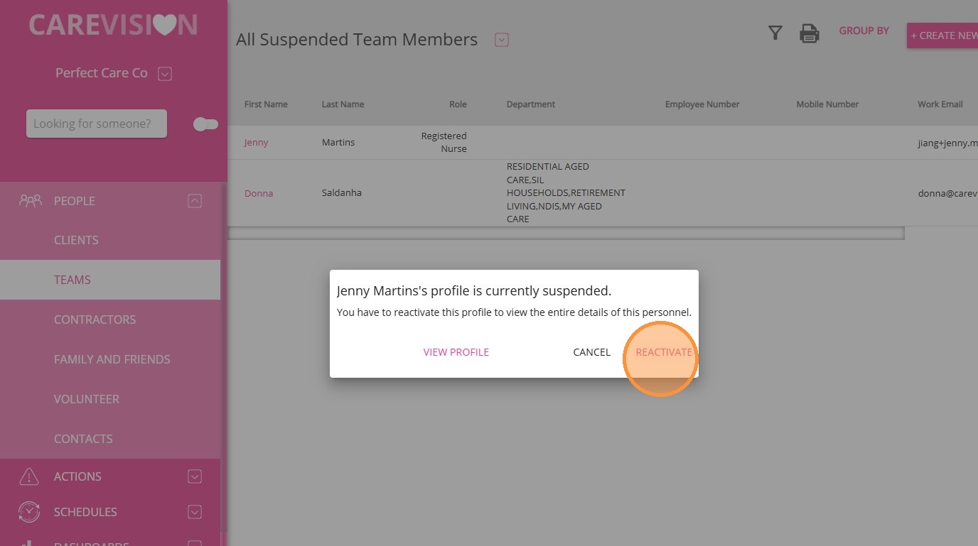 If a staff member returns after leaving the organization (see “Staff Exit”), you can reactivate their suspended profile. Reactivation restores their access and places them back on the scheduling board.