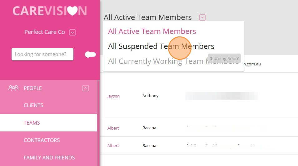 2. At the top of the Teams page, open the dropdown and select All Suspended Team Members.