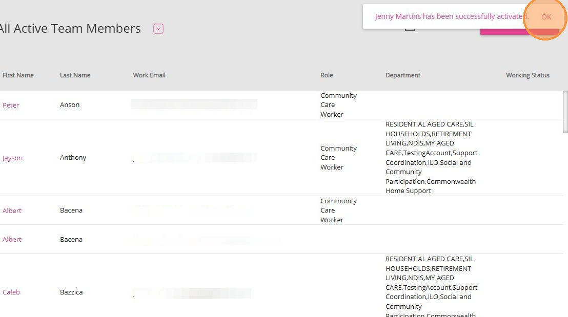 5. A confirmation message will appear if the staff member is successfully reactivated. Click OK.