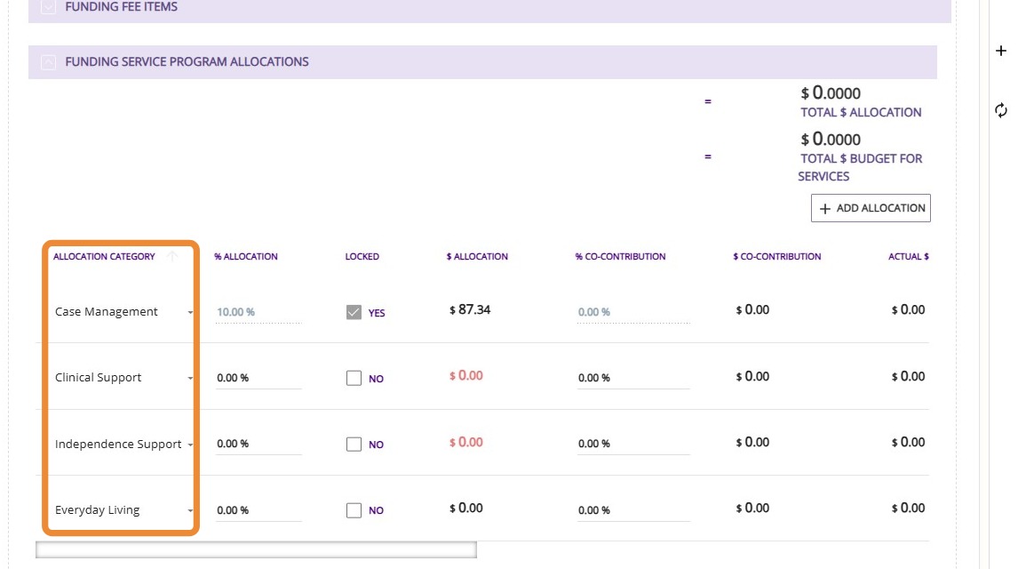 Under the Allocation Category column, the allocation options will be listed based on the funding source template you selected. For Level 1 to 8 or Transitional funding sources, the available categories are Care Management, Clinical Care, Everyday Living, and Independence Support.