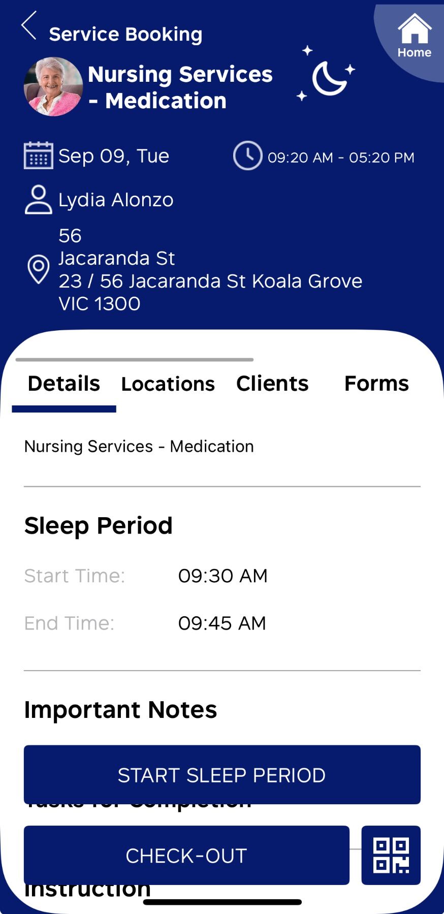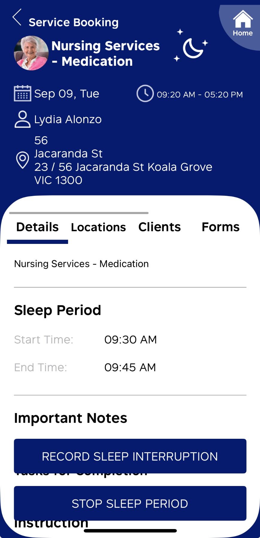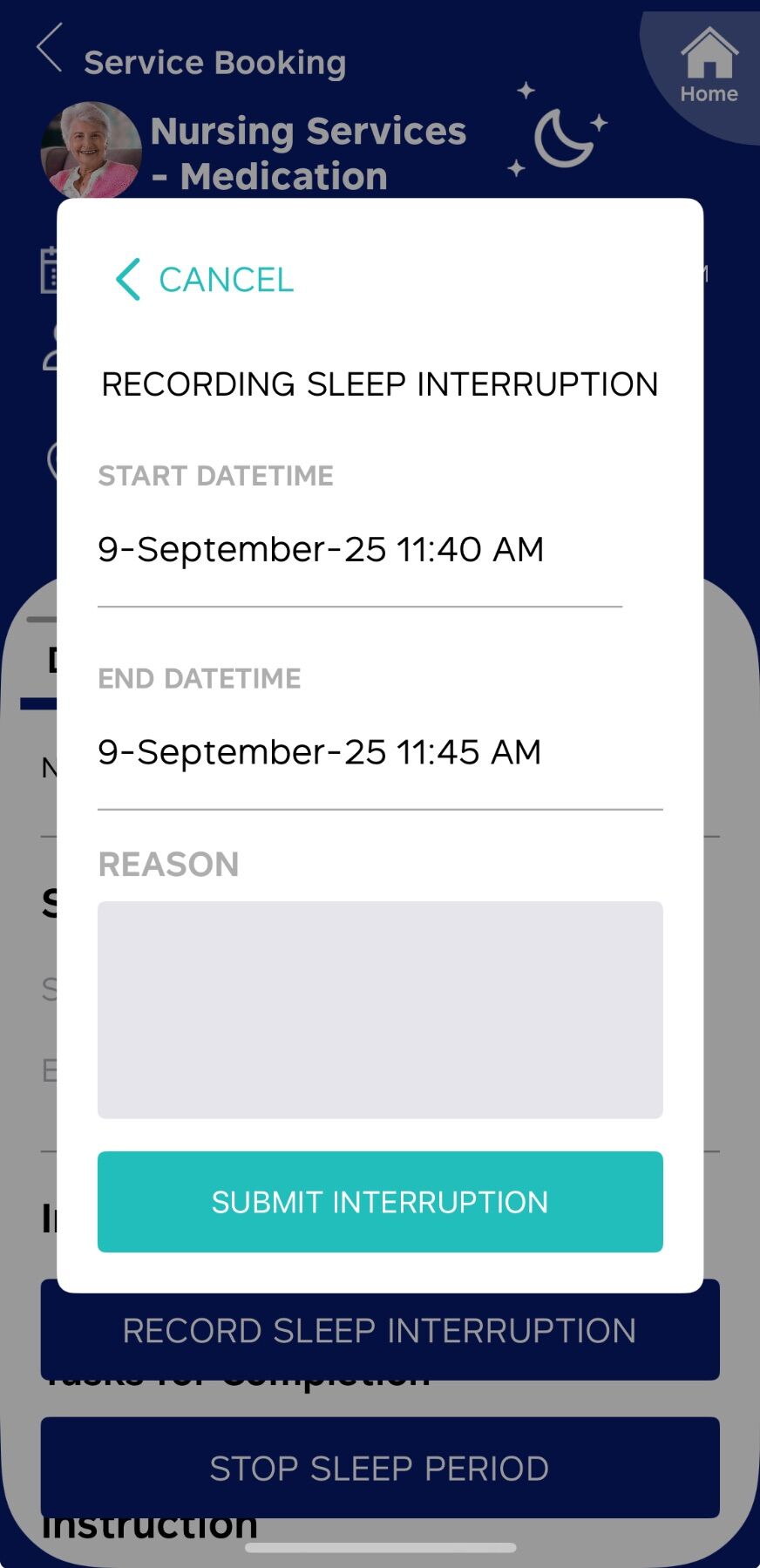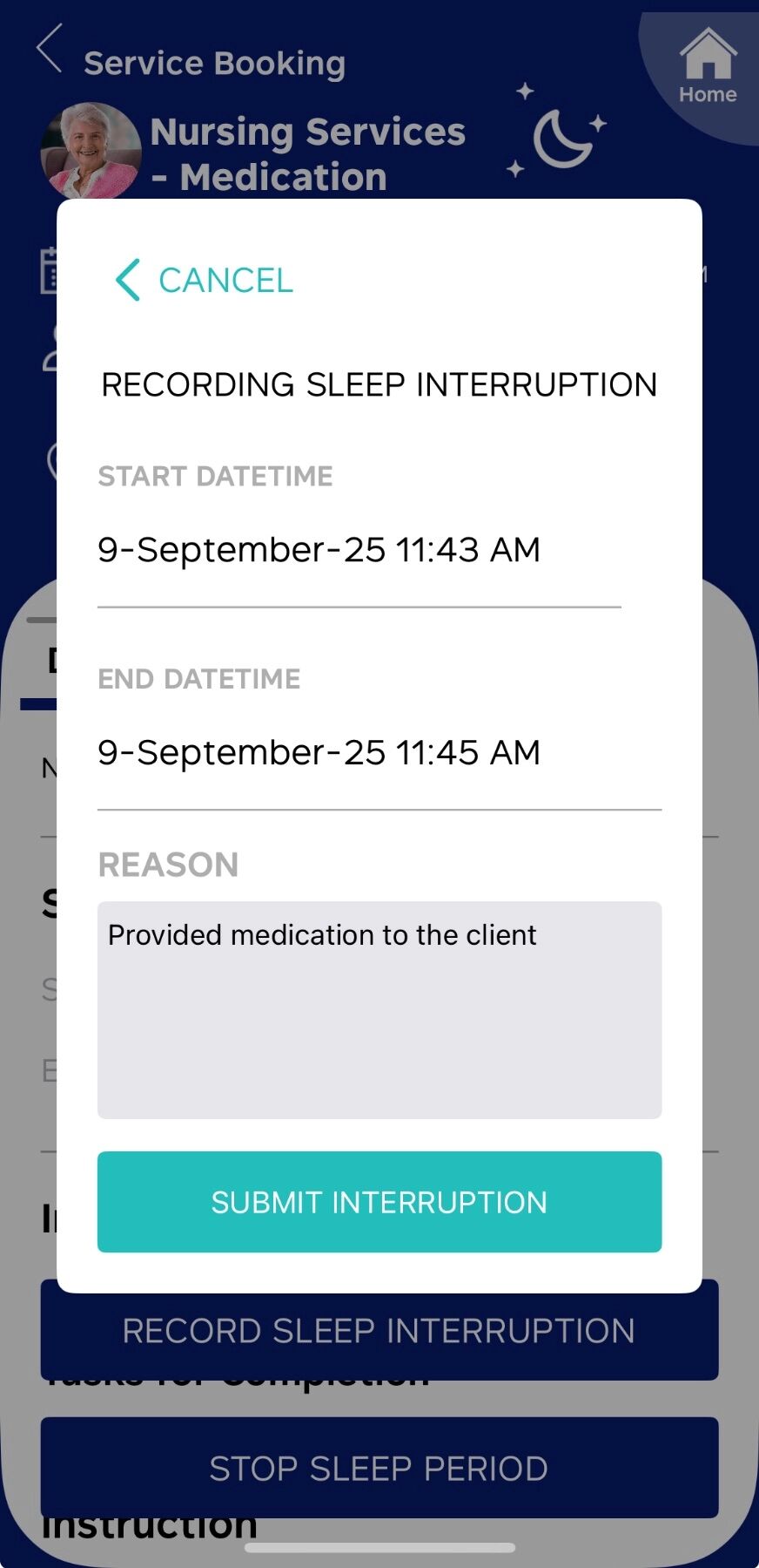 You can use the mobile app to record sleep interruptions. A sleep interruption is a period during the sleep period when you are awakened and required to perform work duties for the client, such as providing medication or responding to their needs.