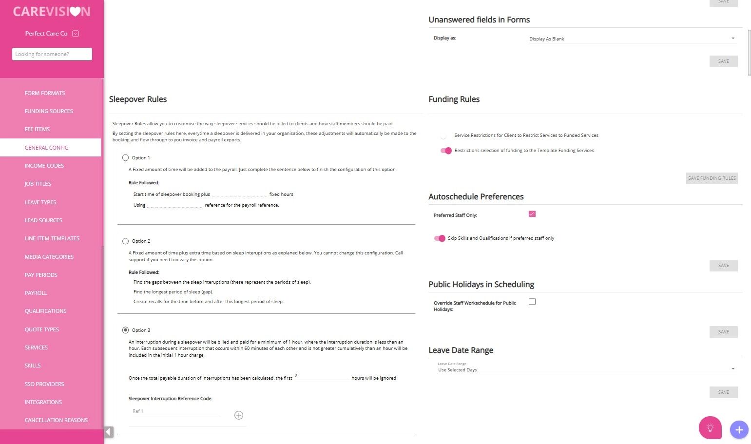 1. Settings in the CareVision portal are configured by administrators to manage how they are applied to Sleepover Bookings, by navigating to Settings > General Config > Sleepover Rules. After the settings are configured, sleepover bookings will be managed based on these rules and will be reflected in invoices and payroll exports.