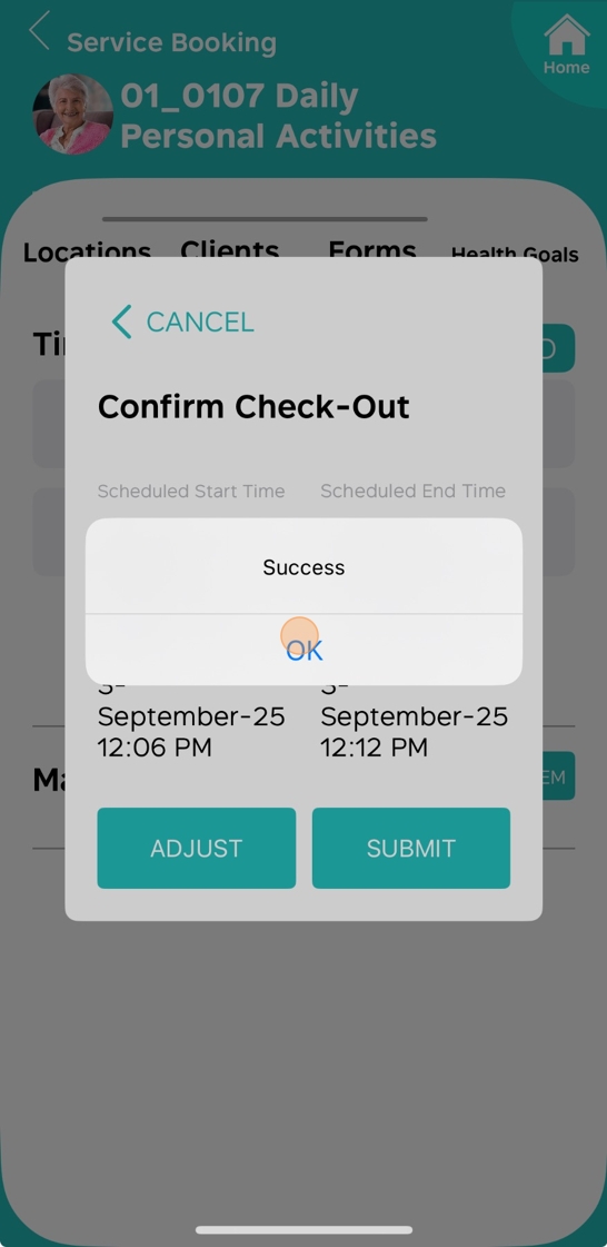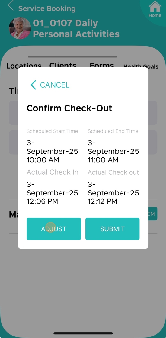 9. Read the details in the Confirm Check-out form, which displays the scheduled start and end times, as well as your actual check-in and check-out times.