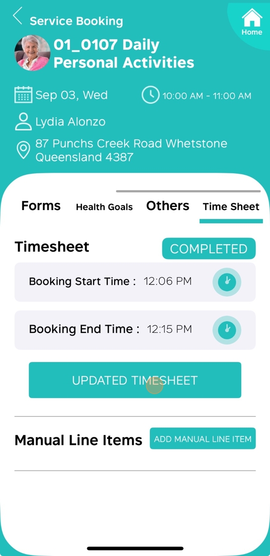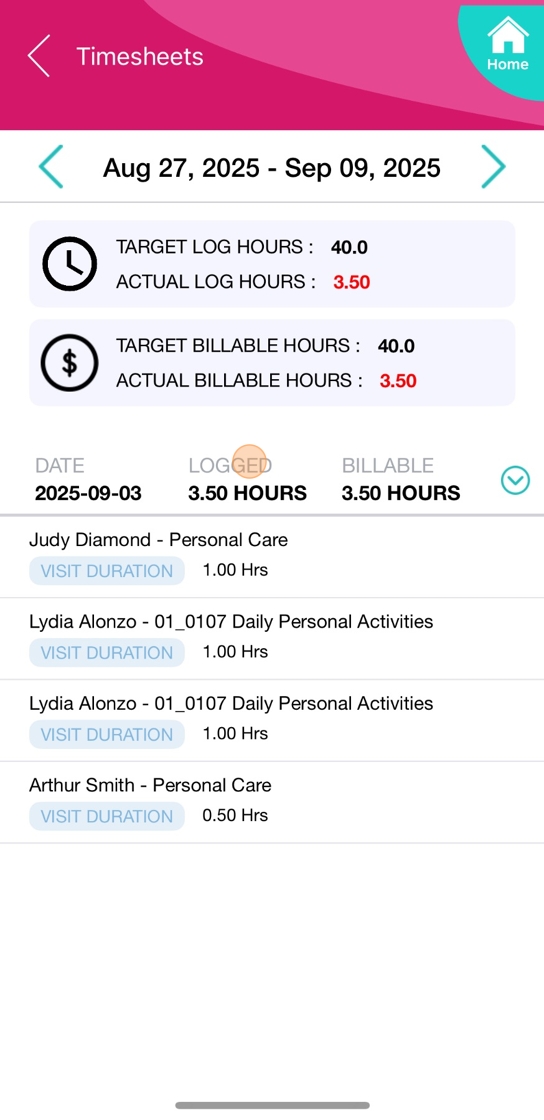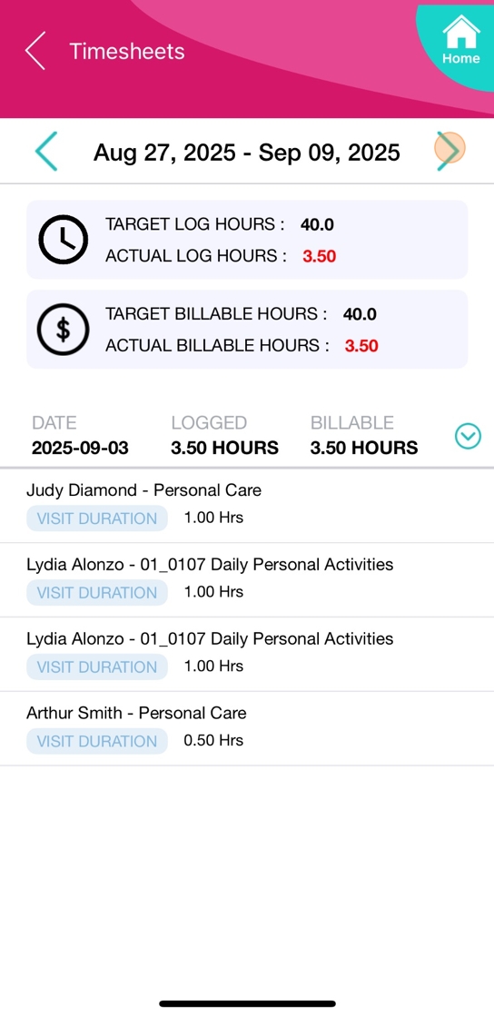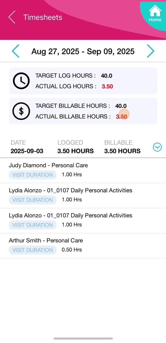 In the Visit Duration section, the way timesheet hours are recorded depends on the settings in the client booking:6. View Target Billable Hours, which represent the expected number of billable hours for the selected pay period, as set by the Coordinator (Admin) user.