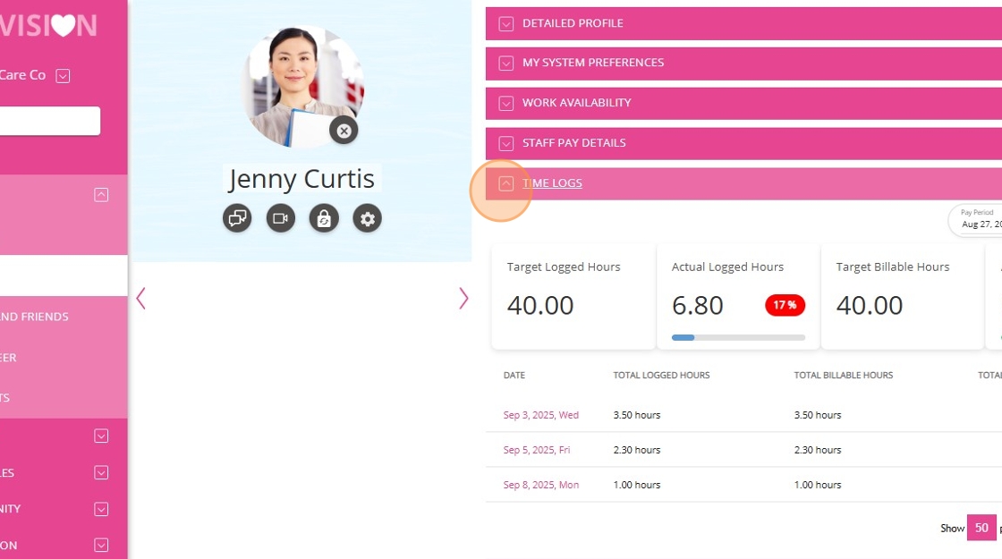 4. In the Time Logs section of the field staff member’s profile, the Target Logged Hours and Target Billable Hours specified by the Coordinator (Admin) user must be accurately reflected.