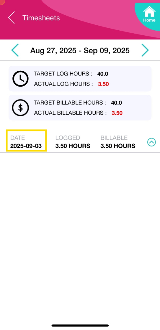 4. View Target Log Hours, which represent the expected number of hours you should log for the selected pay period, as set by the Coordinator (Admin) user.