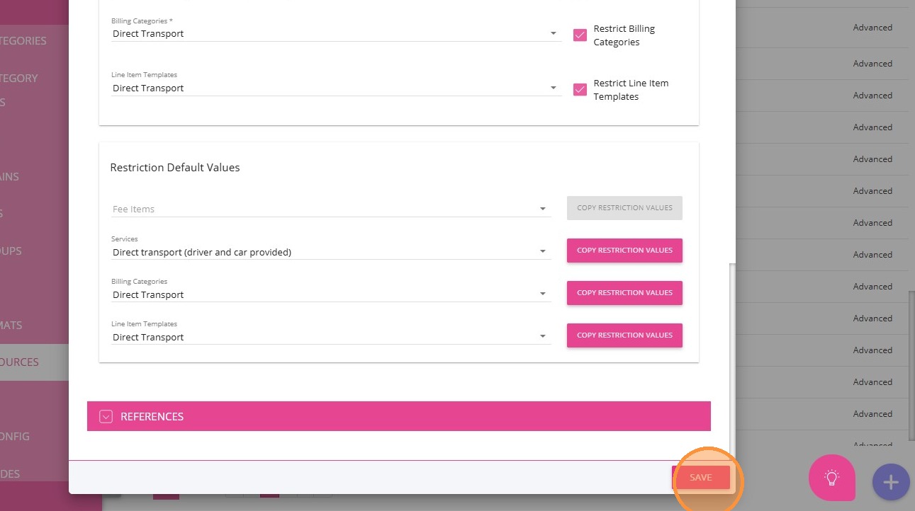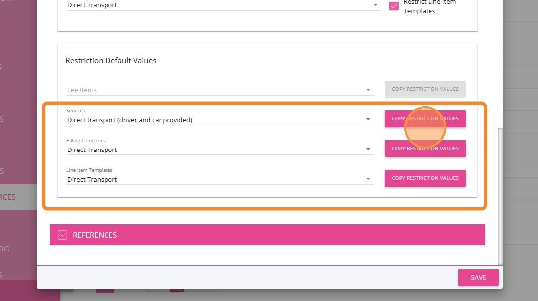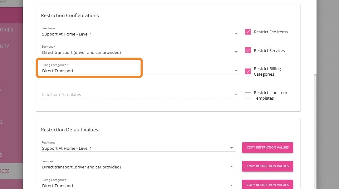 7. Scroll down and click Copy Restriction Values for Services, Billing Categories, and Line Item Templates to apply the same restriction settings across related items.