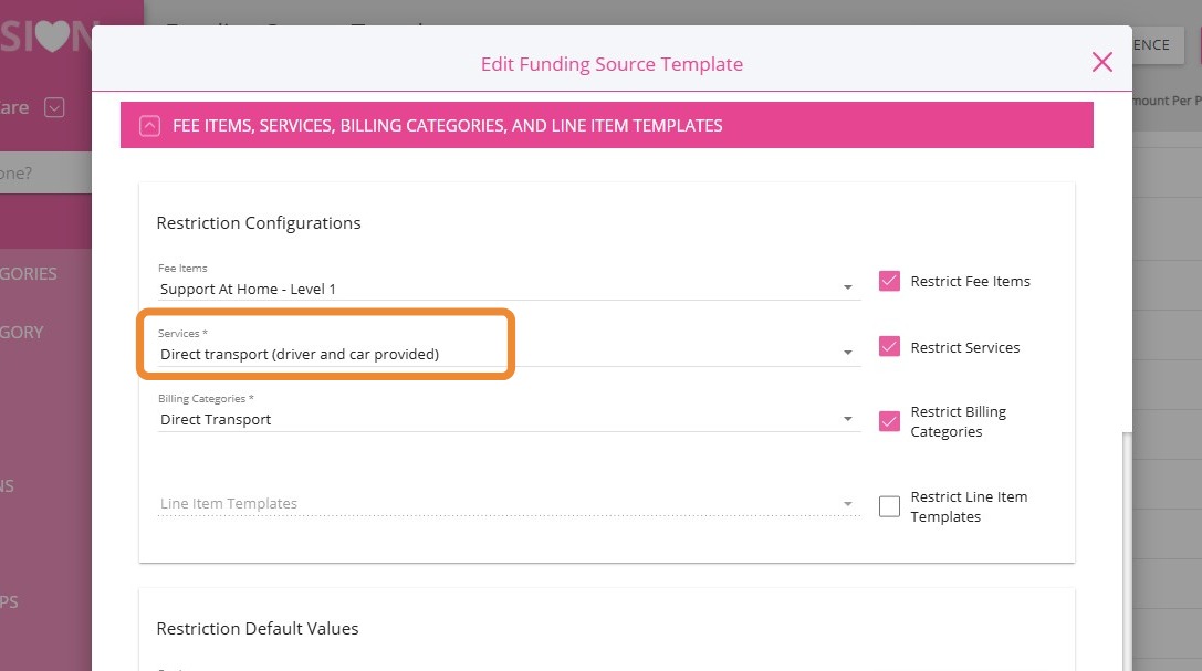 4. Under Services, link the transport service. Click the Restrict Services box to ensure that only the services you selected will be available under the funding source.